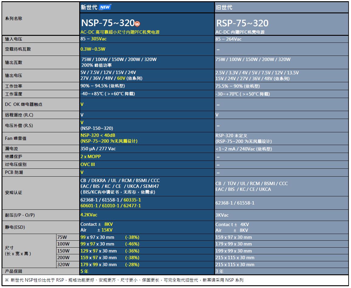 全新 NSP 系列以更高性價(jià)比全面超越 RSP 系列,體積大幅縮小,工作溫度范圍擴(kuò)大至 -40~+85℃,在 +60℃ 仍可滿載運(yùn)行,適用更嚴(yán)苛環(huán)境;同時(shí)通過(guò)資通訊、工業(yè)、醫(yī)療、家電與新能源等多領(lǐng)域安規(guī)認(rèn)證,耐用可靠。NSP 系列可取代舊世代,搭配實(shí)惠價(jià)格,保固年限延長(zhǎng),強(qiáng)化系統(tǒng)降本增效,是為新案設(shè)計(jì)首選。